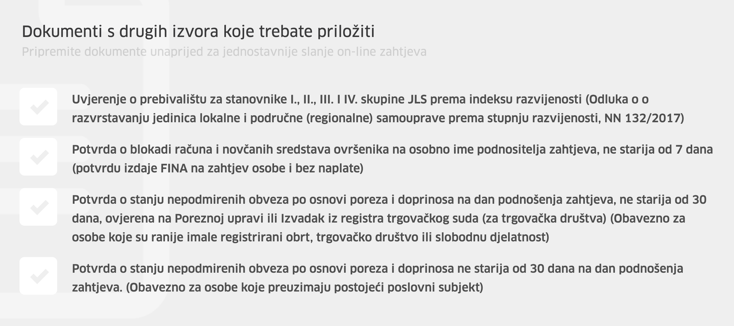 Taj tekst je dio provedbene dokumentacije i predstavlja službene, javno dostupne, kriterije i procedure kako se ocjenjuju zaprimljeni zahtjevi i dodjeljuje pozitivna ili negativna ocjena. Također, pročitajte Opće uvjete koji na jednom mjestu objašnjavaju obveze i prava korisnika potpora.