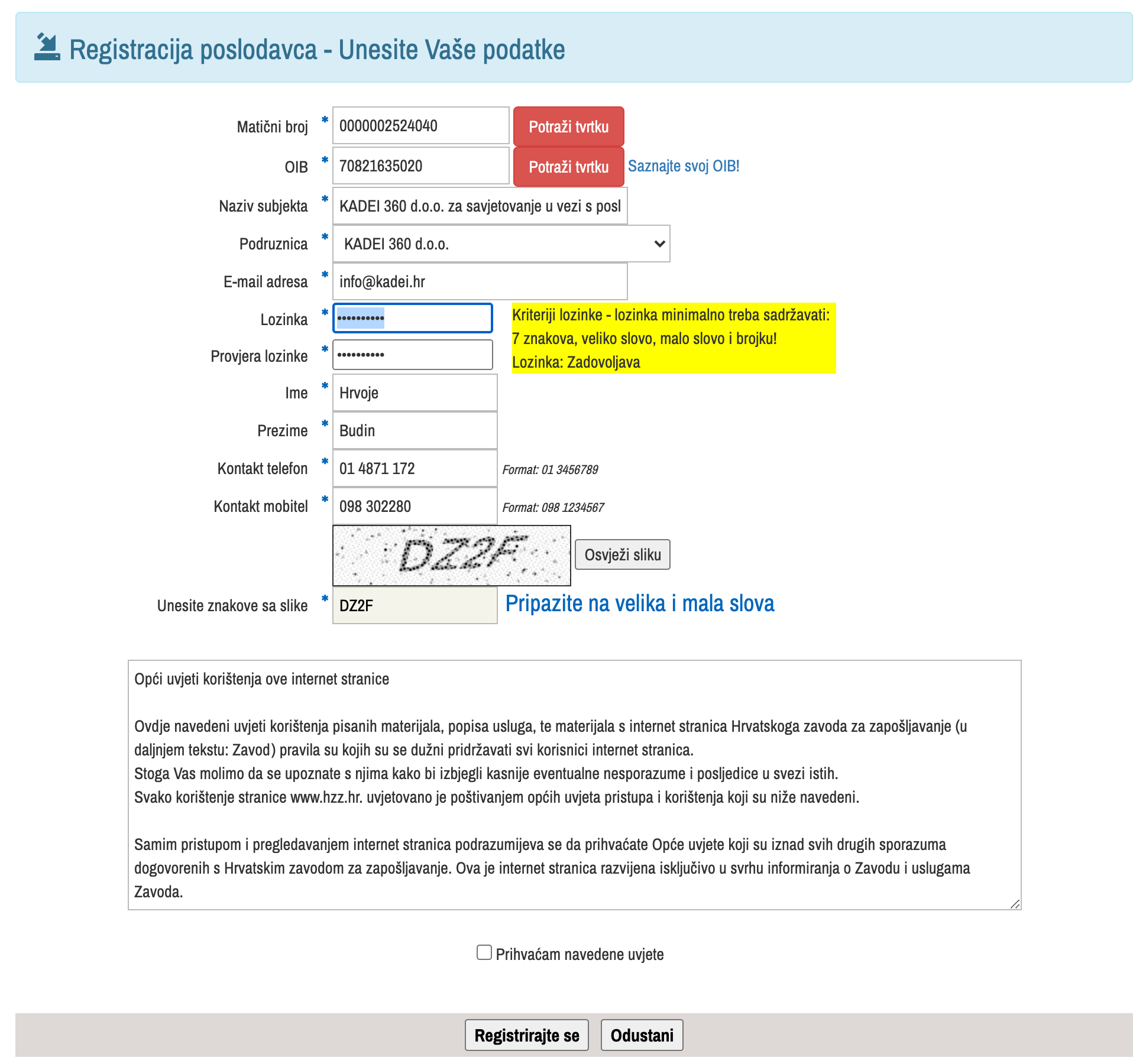 NAPOMENA: Pričekajte do 24 sata aktivaciju korisničkog račun, zbog provjera koje smo dužni napraviti prije nego napravimo vaš HZZ korisnički račun.