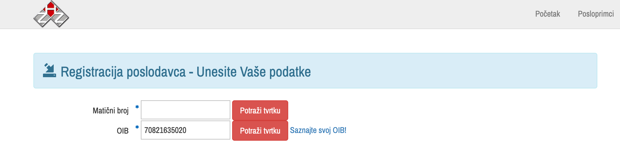 - Na osnovu OIB-a (ili MB-a) u javim registrima pravnih subjekata pronaći ćemo osnovne podatke za izradu HZZ korisničkog računa. Ispunite preostala polja