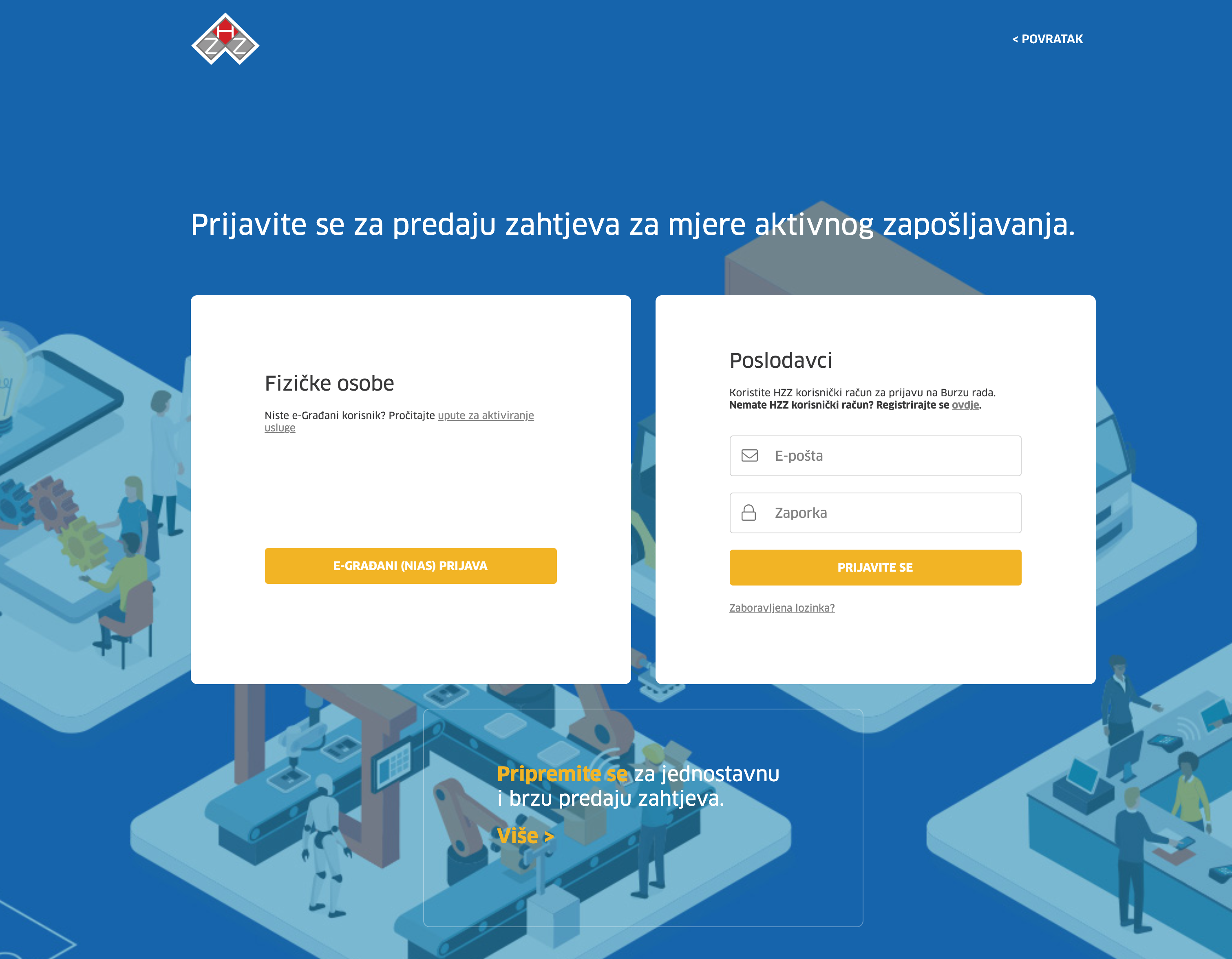 - Na ekranu Prijava za predaju zahtjeva unesite e-mail adresu i lozniku u polja u okviru "Poslodavci" i pritisnite gumb "Prijavite se"