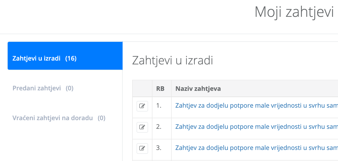 Nakon toga kliknite na navigacijski link Moji zahtjevi za pregled ostalih zahtjeva. U jahaču Zahtjevi u izradi vidjeti će te upravo spremljenu radnu skicu zahtjeva.