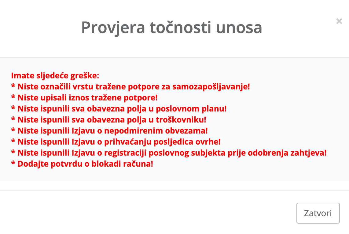 U slučaju da nisu ispunjena obvezna polja, pojaviti će se upozorenje. Morate unijeti obavezna polja.